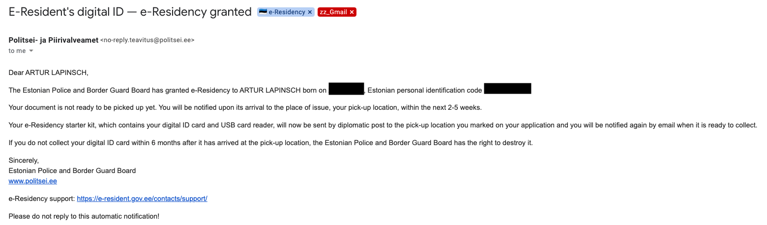 Then another 2 weeks until my e-Residency starter kit was ready for pick up at the Estonian consulate in Berlin.