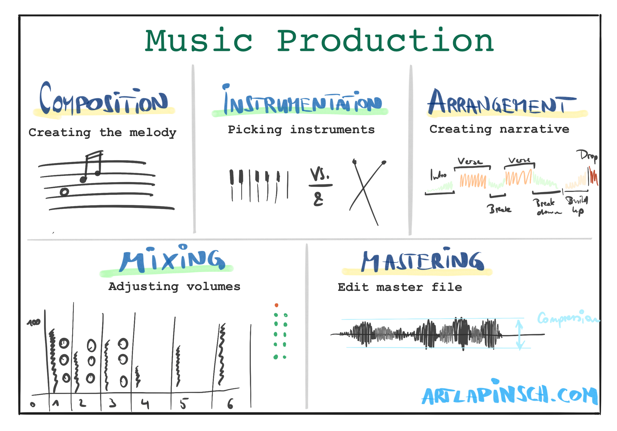 - Learning: Learn the entire process of album production (composition; instrumentation; arrangement; mixing; mastering; distribution)