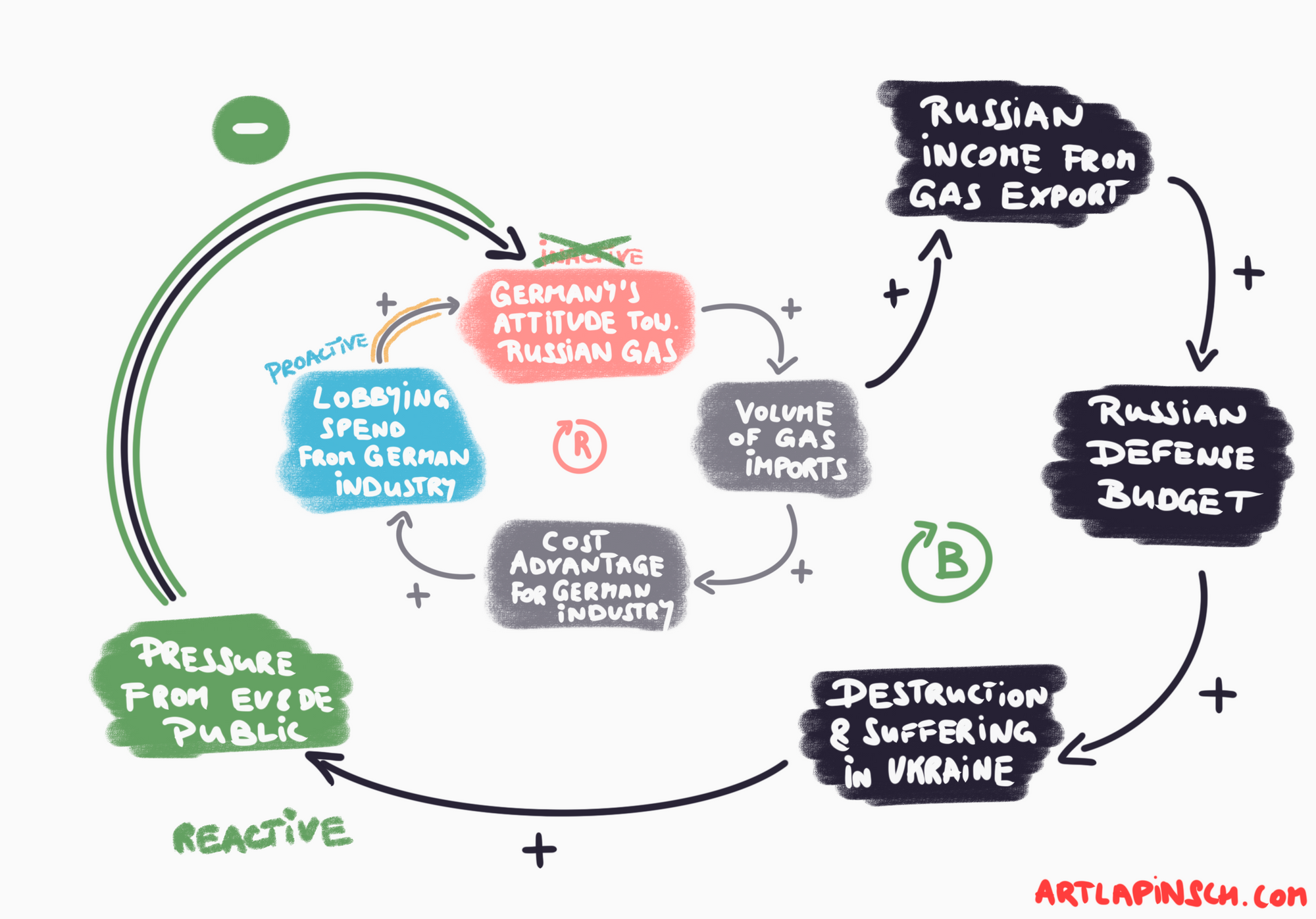 The important aspect in this illustration is that "Pressure from Public" has a negative impact on Germany's attitude towards Russian gas. Once this happens, all the (+) signs in the flow are changed into (-) signs.