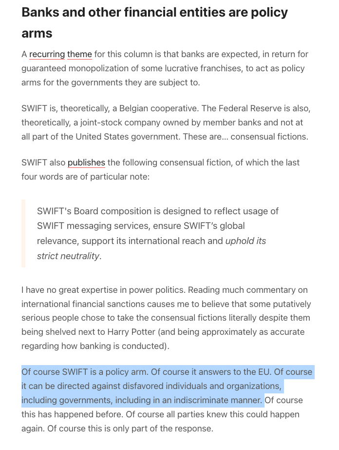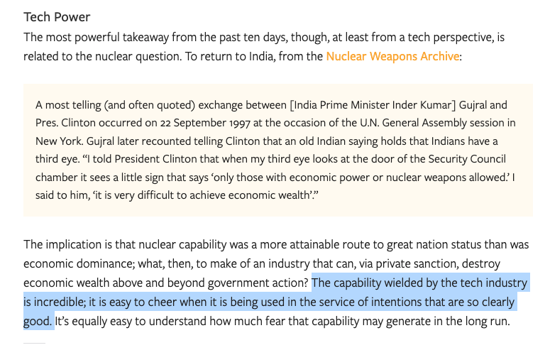 - Tech and War [Ben Thompson] β Ben writes about the important distinction between "capabilities vs intentions" when it comes to tech companies... the corollary is that tech platforms are potentially powerful policy tools similar to SWIFT